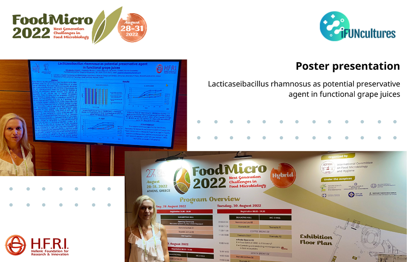 Το έργο iFUNcultures συμμετείχε στο συνέδριο FoodMicro2022 που πραγματοποιήθηκε αυτή την εβδομάδα (28-31/8/2022) στο Διεθνές Συνεδριακό Κέντρο του Μεγάρου Μουσικής Αθηνών στην Ελλάδα με την αναρτημένη εργασία (poster) με τίτλο "Lacticaseibacillus rhamnosus as potential preservative agent in functional grape juices" που παρουσιάστηκε από την Γρηγορία Μητροπούλου (συμμετείχαν επίσης οι Αναστάσιος Νικολάου, Γρηγόριος Νέλιος, Δήμητρα Δημητρέλλου και Ιωάννης Κουρκουτάς).